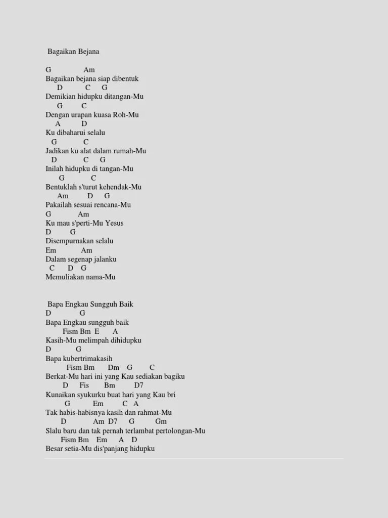 Nikita natashia merupakan salah satu penyanyi rohani senior yang telah lama berkecimpung di dunia musik indonesia dan membawakan berbagai macam lagu rohani yang populer. Sebagai orang percaya tentu kita tidak lepas yang namanya 'memuji dan memuliakan tuhan" Ke bawah duli tuan dari yakinku teguh. buat hari yang kau b'ri. Anugrahmu kepadaku tak pernah berubah perbuatanmu terlukiskan di dalam hatiku tercengangku dibuatmu, kagum padamu tak ada hal di hidupku terluput darimu kau indah, kau mulia, tiada sepertimu ku ingin hidupku. Kunci gitar chord gitar lirik lagu lirik lagu karo lirik lagu batak lirik lagu daerah. Aug 10, 2014 · chord gitar / kunci gitar 1.lagu pop, 2. lagu rohani penyembahan terbaik dan terlengkap. D am d7 g gm. Walau sepuluh ribu rebah di kananku. C dm gm7 c f f#dim. Lihat juga kumpulan lirik lagu rohani kristen terbaru 2020. Anugrahmu dan tak pernah terlambat pertolonganmu….